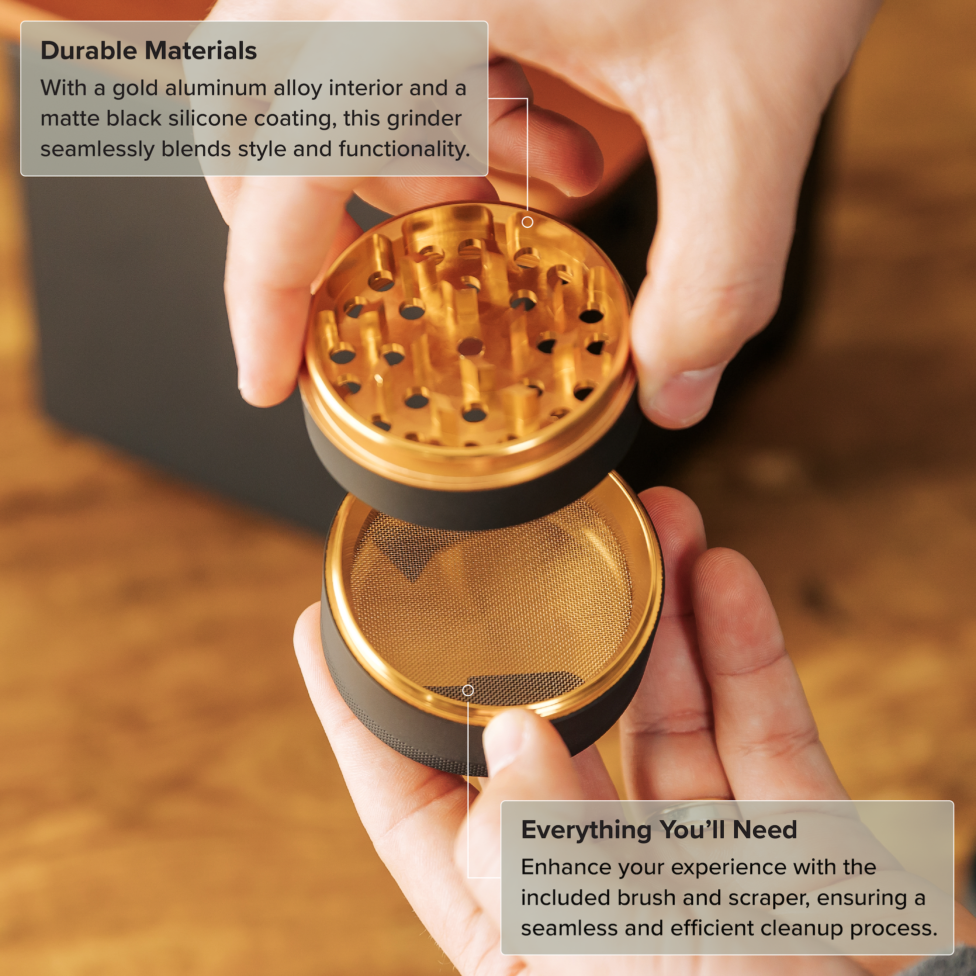 Crafted for lasting quality, our grinder combines a comfortable silicone-coated grip with a resilient aluminum alloy interior. Maintenance is a breeze with included cleaning tools—a dedicated brush and scraper. Enjoy a long-lasting and hassle-free grinding experience.